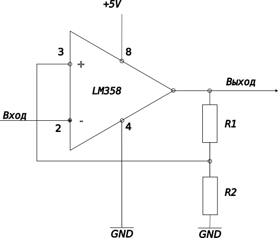 Операционный усилитель запитывается от однополярного 5 вольтового источника питания. На инвертирующий вход подается синусоидальный сигнал переменной амплитуды. Резисторы R1 и R2 имеют номиналы 1 kОм и 10 Ом соответственно.
