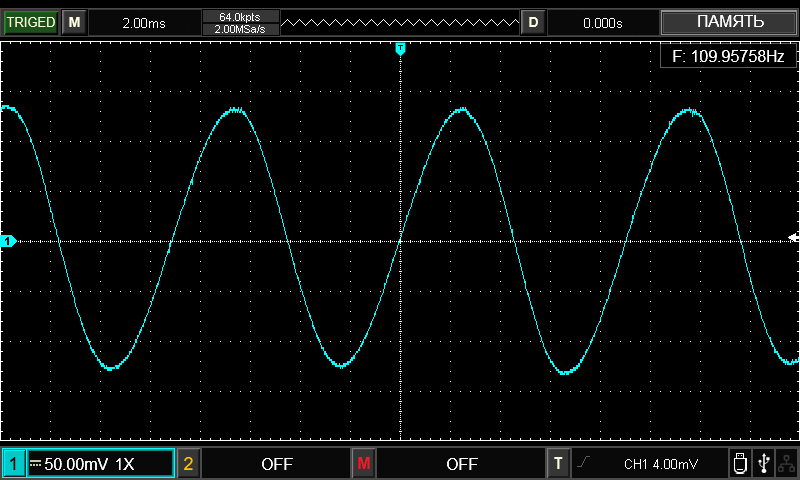 Таким образом преобразователь ТПР предназначен для выдачи информации об объемном расходе измеряемой жидкости в виде электрического сигнала синусоидальной формы, частота которого на верхнем пределе измерения составляет (25025)Гц. На рисунке представлен вид осциллограммы с выходов датчика.