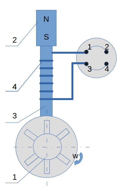 На рисунке 1- турбинка, 2 — магнит, 3 — сердечник, 4 — катушка.